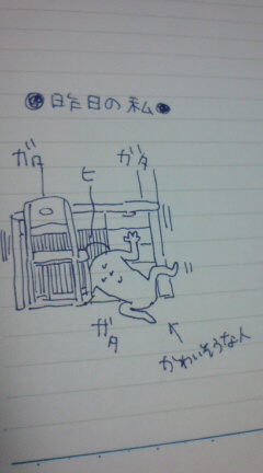 地震恐い!地震恐い!なんでこんな連発するんだよう!しかも段々強くなってないか!まだ揺れてるような錯覚ある(((´Д`;)))…じゃなくて揺れとる!思わず机の下潜った(汗)
